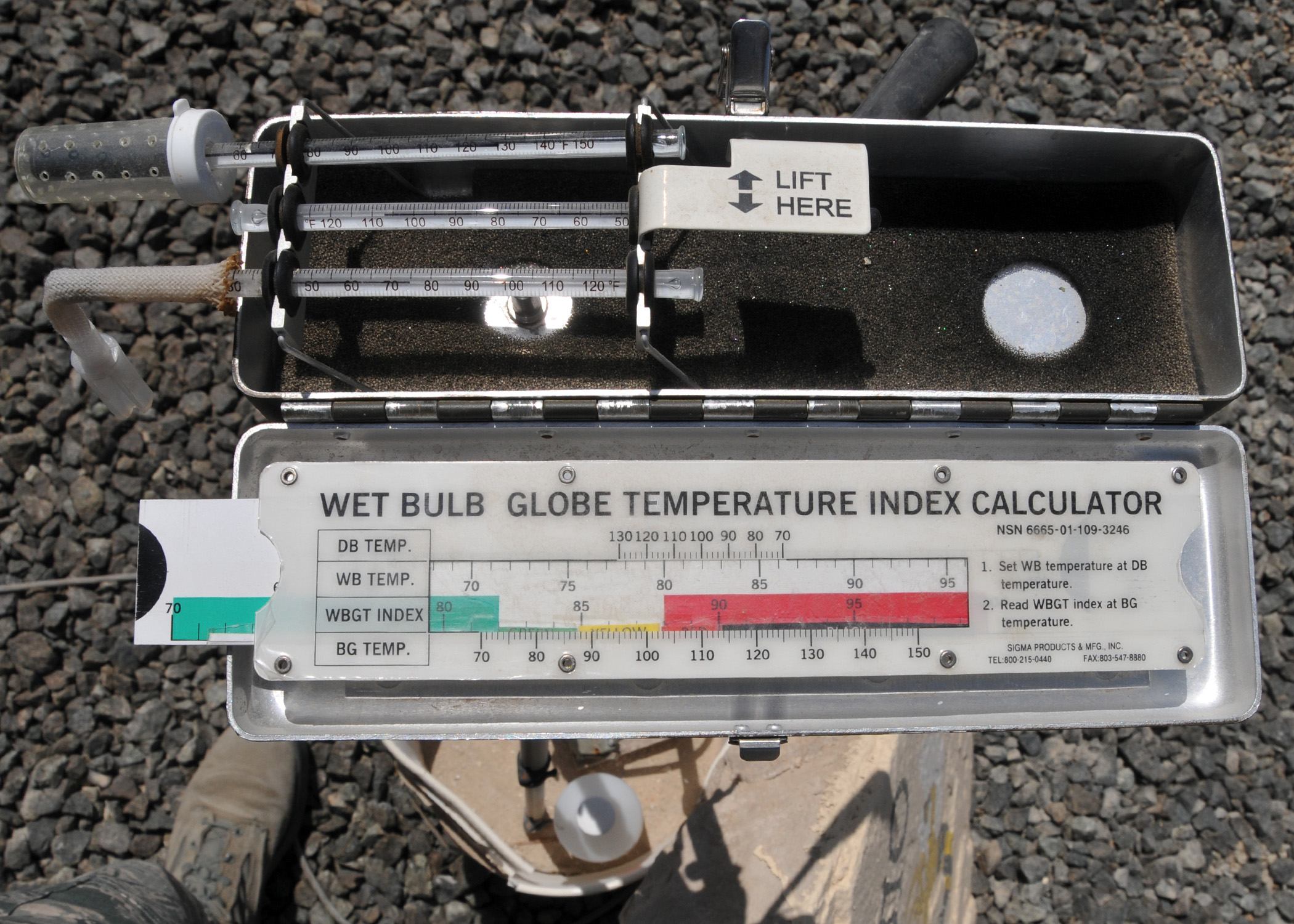 So service members receive training on how to diagnose and treat such illnesses, how much water they should drink to remain hydrated, how to adjust hydration and work schedules based on environmental factors — break out the wet bulb globe temperature index calculator to gauge the threat level — and, yes, how to gauge their hydration levels based on urine color.