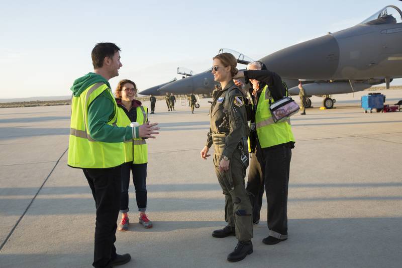 “The thing I found so unique about this character was that sense of humor, mixed with total capability in whatever challenge comes her way, which, I realized after going to the Air Force base, is really what Air Force pilots are like.” Larson said in the video, which also showed her flying in an F-16 at Nellis.