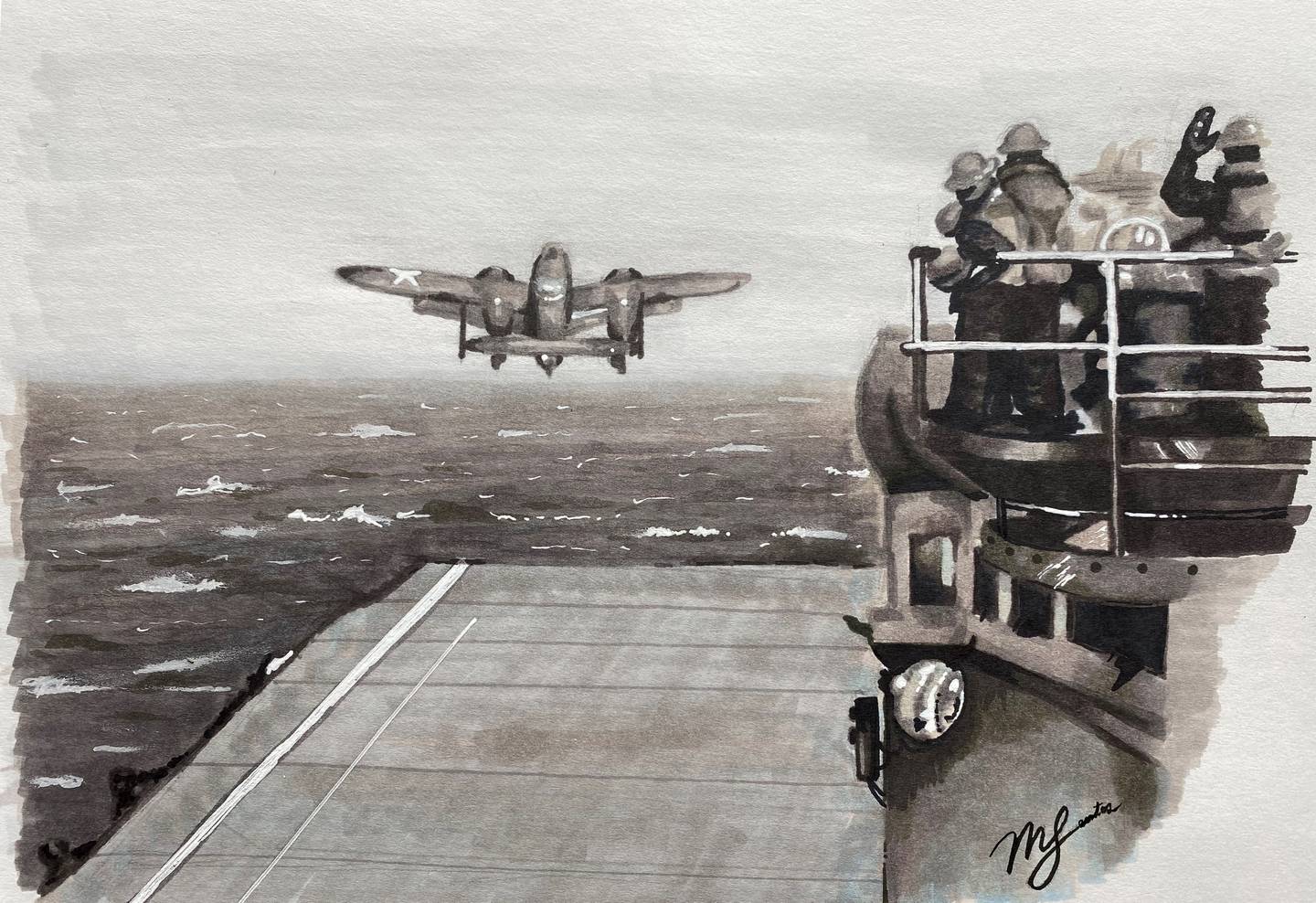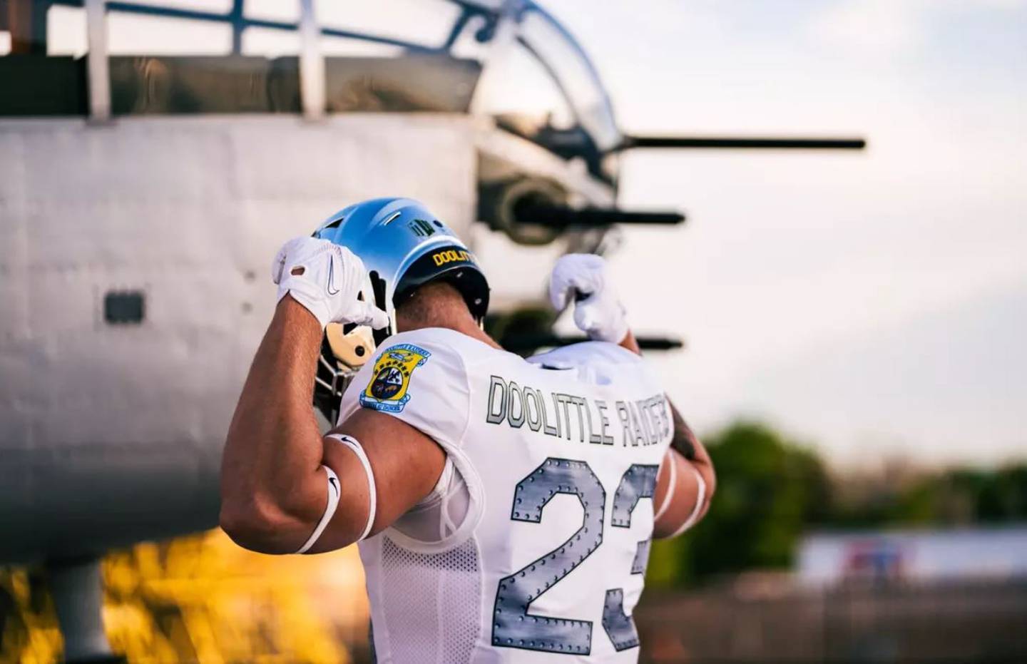The uniforms themselves feature a chrome helmet with “B-25″ on the front and nicknames of specific planes or “Doolittle” on the back, honoring Lt. Col. James H. “Jimmy” Doolittle, who led the attack. The multiple-city raid was launched by the U.S. Army Air Forces on April 18, 1942, by 80 pilots and crew of 16 B-25B Mitchell bombers that took off from the Navy aircraft carrier Hornet.