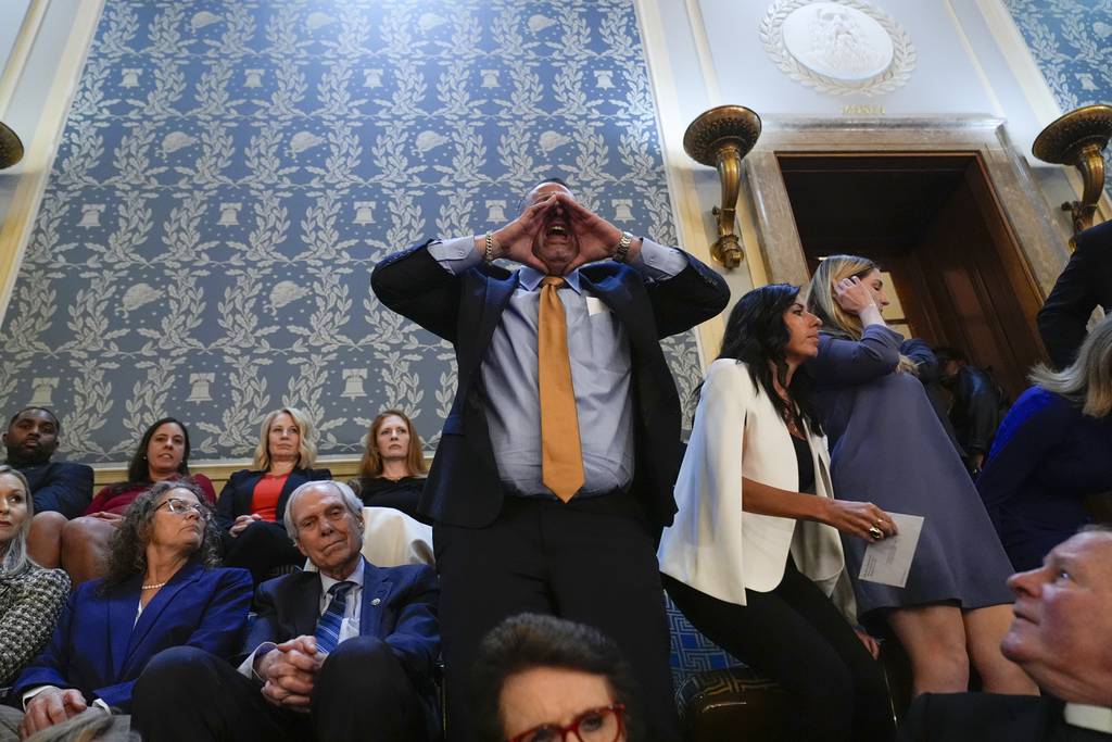 Steve Nikoui, the invited guest of Rep. Brian Mast, R-Fla., was escorted out of the House chamber after screaming “Abbey Gate” and “Marines” multiple times at President Joe Biden as he spoke about violent crime in America. Biden glanced briefly at Nikoui before Capitol Hill security forced him out of the chamber.