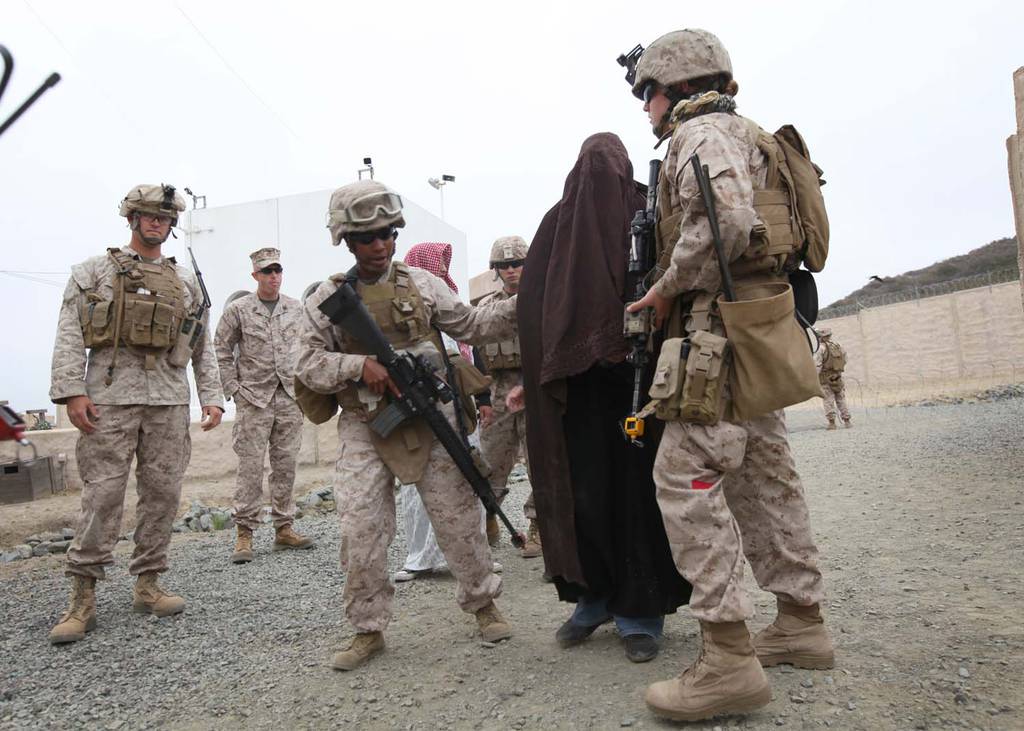 Lance Cpl. Sarah Dixon, a motor transportation mechanic with the 13th Marine Expeditionary Unit female engagement team detachment, escorts a role-player during a training exercise at Camp Pendleton, Calif., in 2013. The Corps is sending female engagement teams with its Marine expeditionary units because they can perform vital functions, like searching, interrogating or even training women where men and women mix because of cultural taboos. (Photo: Cpl. Joshua Young/Marine Corps)