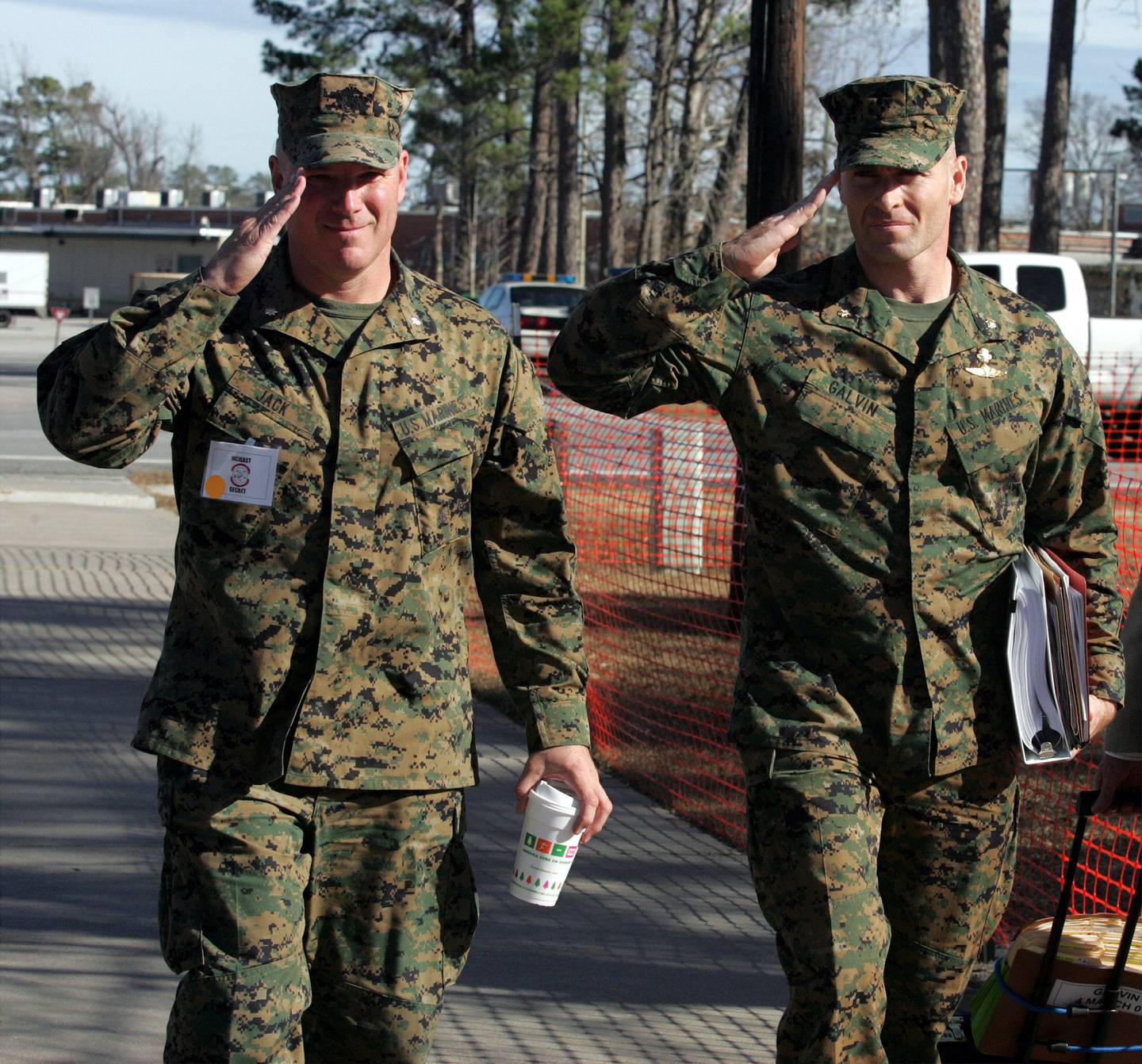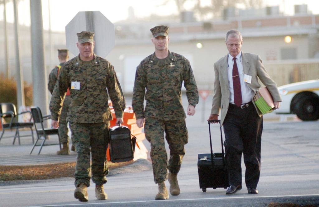 Lt.Col. Scott Jack, left, walks into court with his client Maj. Fred Galvin on Jan. 8, 2008 at Camp Lejeune, North Carolina.
