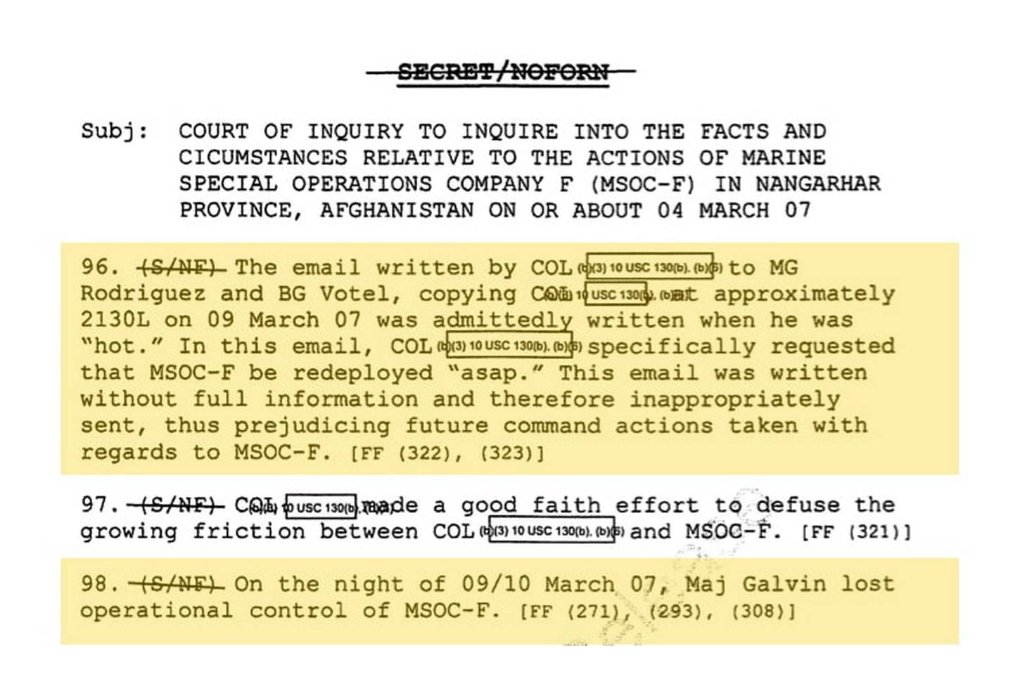 Ukeiley’s email, the court determined, proved the catalyst for Kearney’s decision to evict Fox Company from Afghanistan. Haas and other leaders read it as fact whereas many of the failures Ukeiley outlined “were in reality his own and those of the CJSOTF-A staff” in Bagram, the court report says. Had Ukeiley taken the time to read the request outlining the March 9 mission, he could have answered the questions Haas and Nicholson posed about Fox Company’s planned activity that night in and around Jalalabad, the court report says. Those in charge could have canceled the mission before the Marines departed.