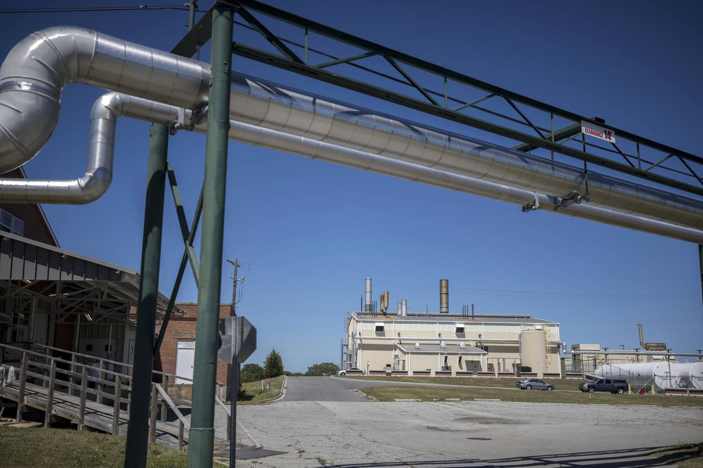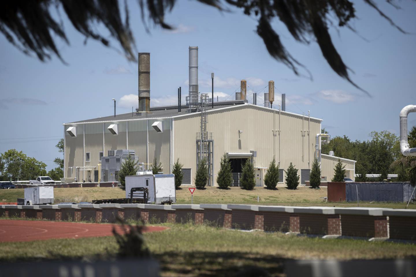 Framed by Parris Island's iconic steam pipes, the newly constructed power station was elevated to withstand storm surge from hurricanes, Wednesday, May 11, 2022, in Parris Island, S.C. (Stephen B. Morton/AP)