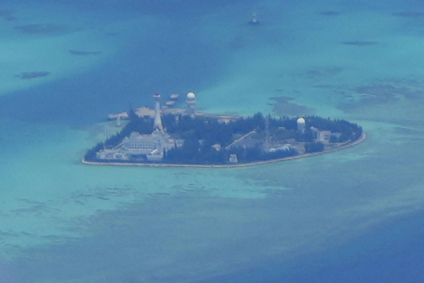 Chinese structures and buildings at the man-made island on Johnson Reef at the Spratlys group of islands in the South China Sea are seen on Sunday March 20, 2022. (Aaron Favila/AP)