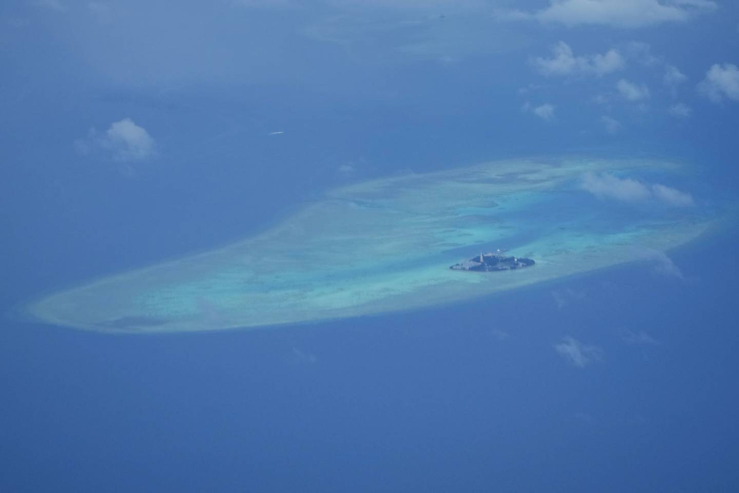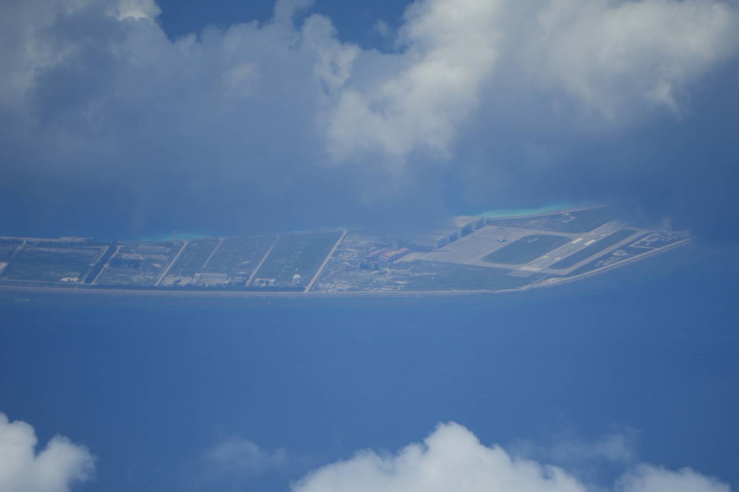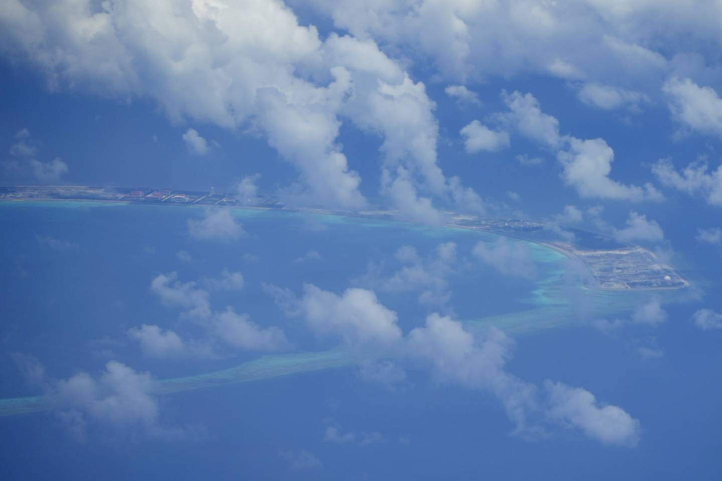 Clouds partly cover Chinese structures and buildings at the man-made island on Mischief Reef at the Spratlys group of islands in the South China Sea are seen on Sunday March 20, 2022. (Aaron Favila/AP)