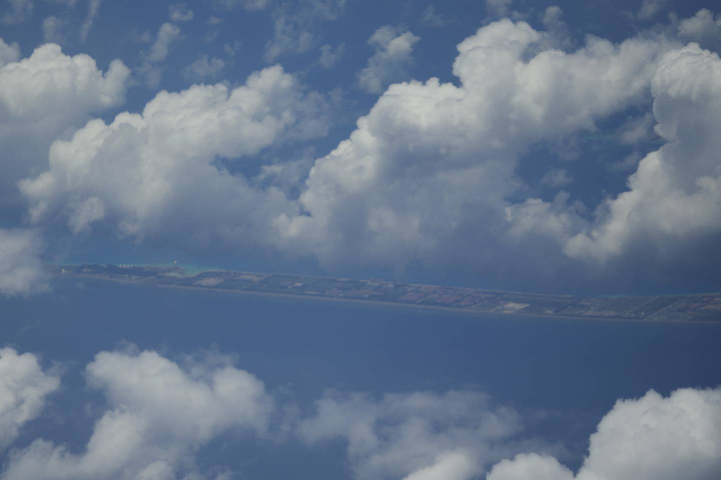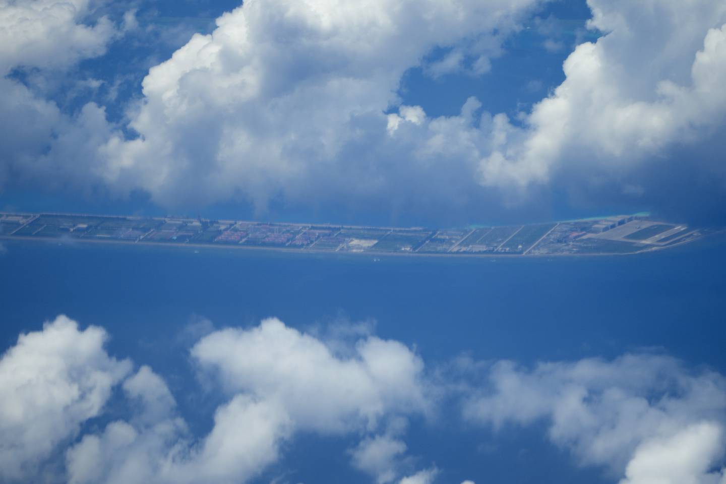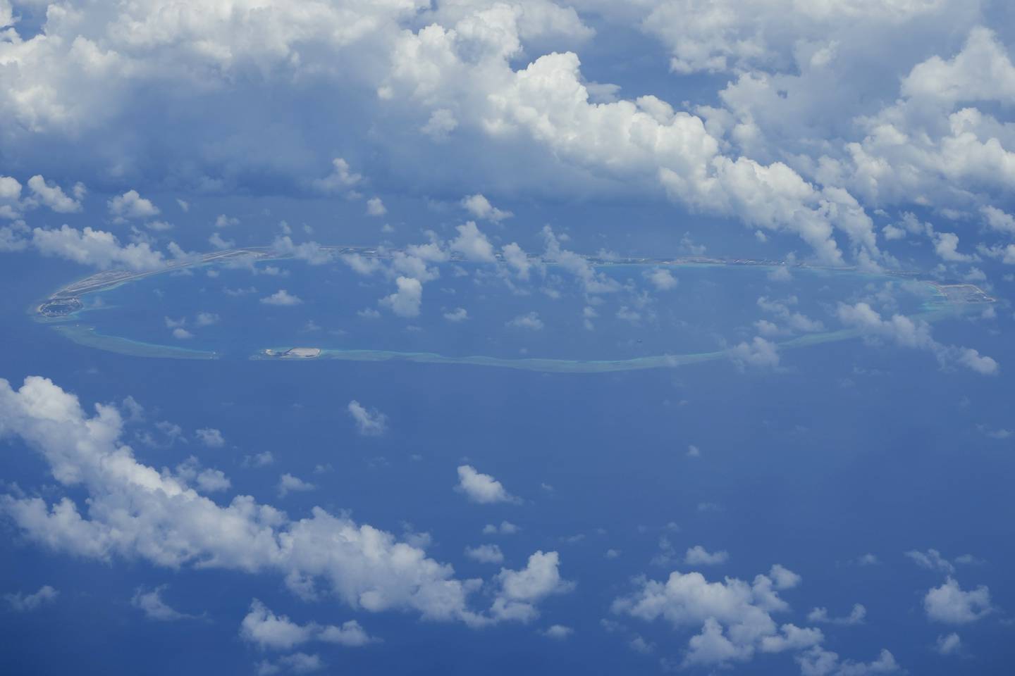Clouds partly cover Chinese structures and buildings at the man-made island on Mischief Reef at the Spratlys group of islands in the South China Sea are seen on Sunday March 20, 2022. (Aaron Favila/AP)