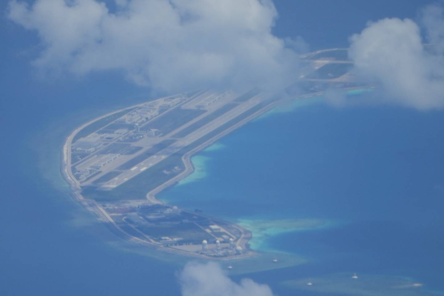 Boats are seen beside Chinese structures and buildings on the man-made Fiery Cross Reef at the Spratlys group of islands in the South China Sea on Sunday March 20, 2022. (Aaron Favila/AP)
