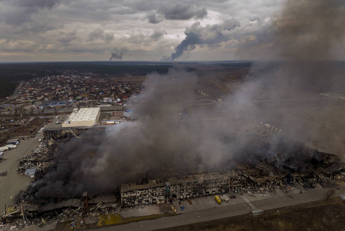 A factory and a store burn after being bombarded in Irpin, on the outskirts of Kyiv, Ukraine, Sunday, March 6, 2022. (Emilio Morenatti/AP)