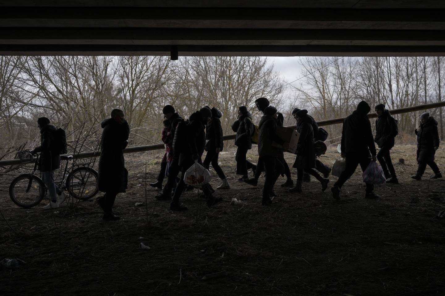 People cross on an improvised path under a bridge that was destroyed by a Russian airstrike, while fleeing the town of Irpin, Ukraine, Saturday, March 5, 2022. (Vadim Ghirda/AP)