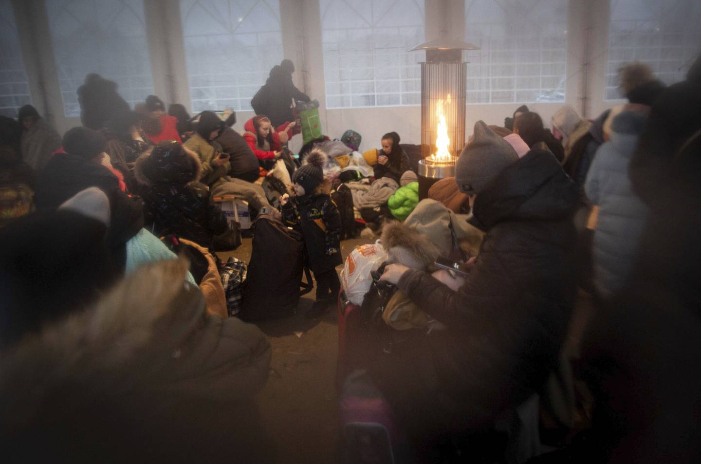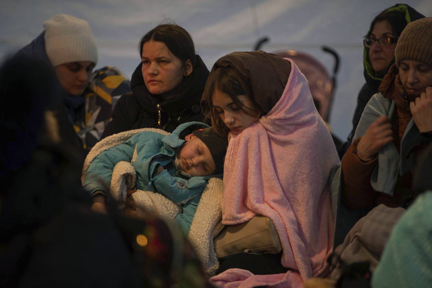 Refugees, mostly women with children, rest inside a tent after arriving at the border crossing, in Medyka, Poland on Sunday, March 6, 2022. (Visar Kryeziu/AP)