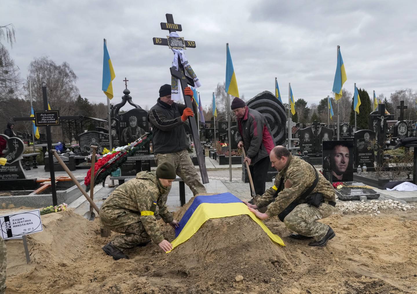 Ukrainian paramedics cover a grave with their country's flag of their colleague Valentyna Pushych, who was killed by Russian troops in a cemetery in Kyiv, Ukraine, Saturday, March 5, 2022. (Efrem Lukatsky/AP)