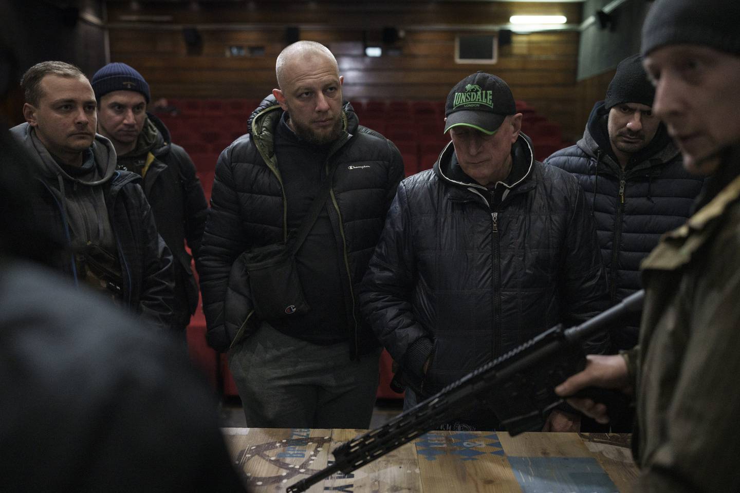 Ukrainian civilians receive weapons training inside a cinema in Lviv, western Ukraine, Saturday, March 5, 2022. (Felipe Dana/AP)