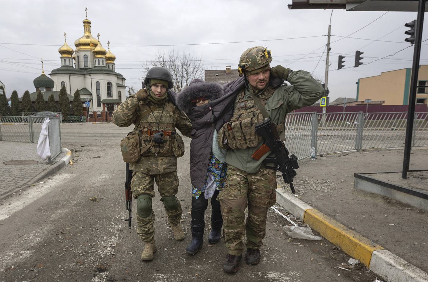 Ukrainian servicemen help an elderly woman, in the town of Irpin, Ukraine, Sunday, March 6, 2022. (Andriy Dubchak/AP)