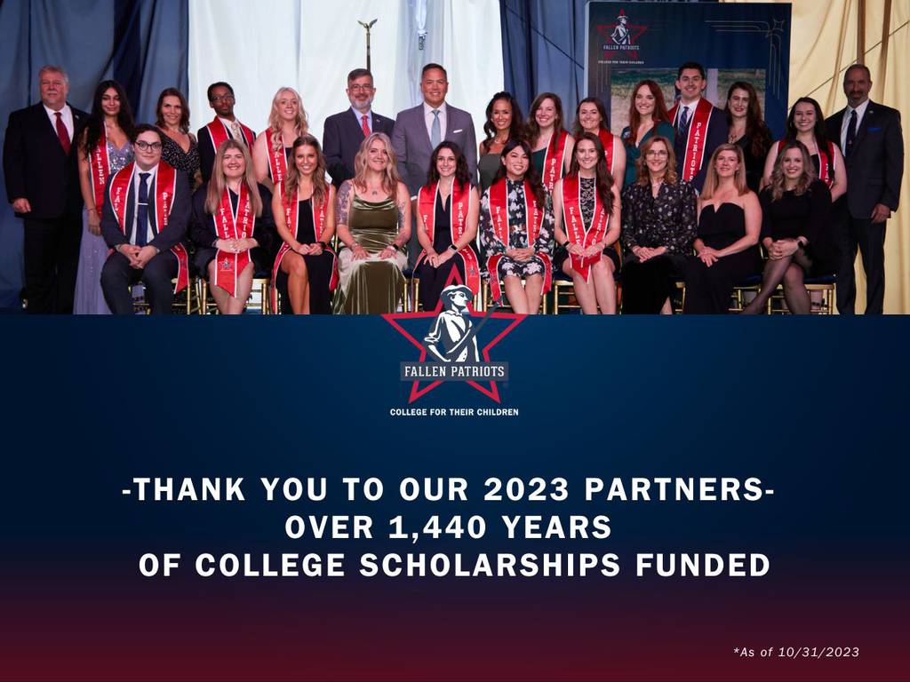 As 2023 draws to a close, Children of Fallen Patriots Foundation would like to extend a heartfelt thanks to the generous donors, corporate partners, and supporters whose generosity has helped to fund over 1,440 years of college scholarships for the children of the nation’s fallen this year.