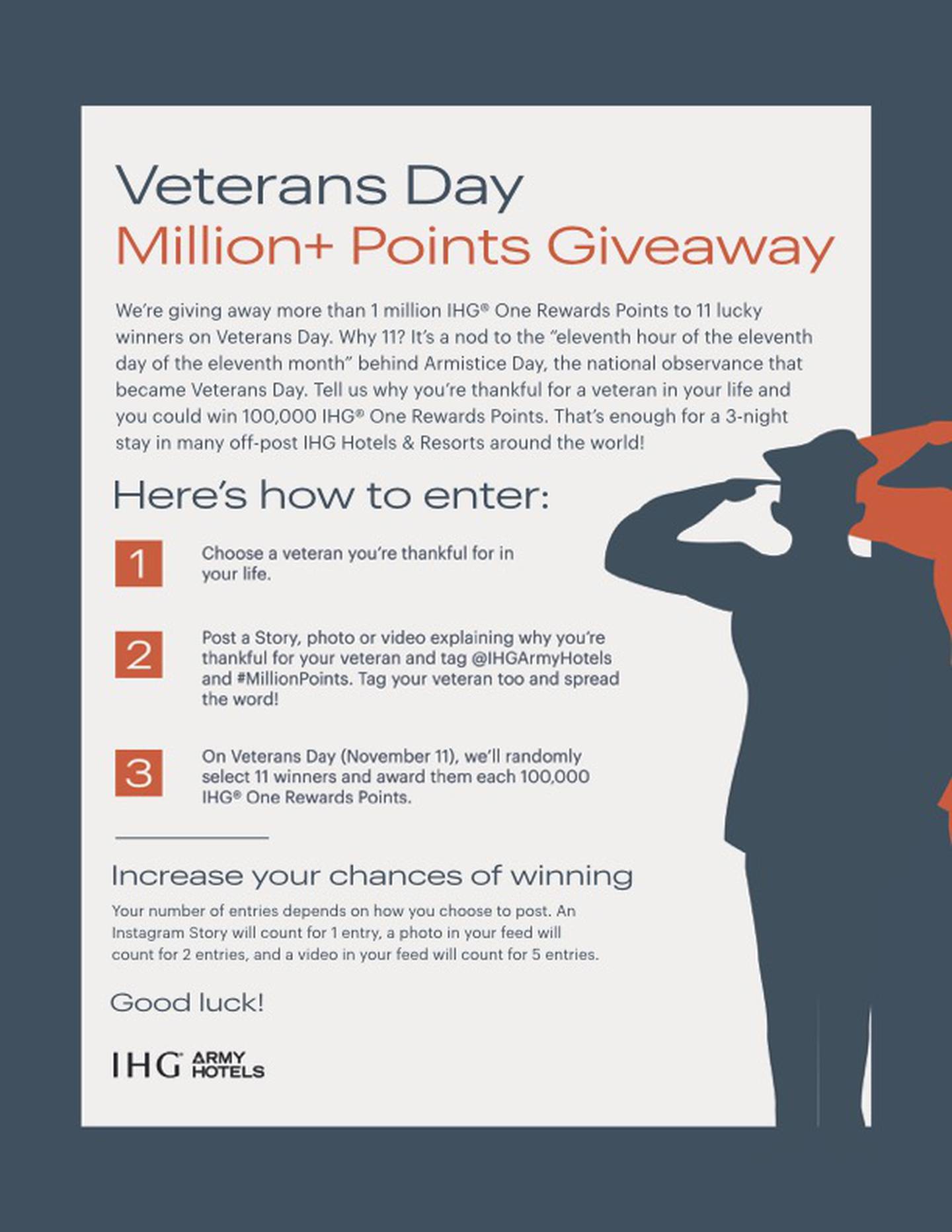 For IHG Army Hotels, Veterans Day is also a time to celebrate the military community. We’re excited to announce that we’re giving away more than 1 million IHG Rewards points in a random drawing on Veterans Day. In the spirit of the annual date (11/11), we’re awarding 11 lucky winners 100,000 points. That’s enough for up to a 5-night stay in many off-post IHG Hotels & Resorts around the world.